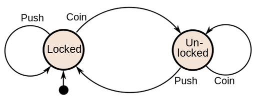 A turnstile, used to control access to subways and amusement park rides, is a gate with three rotating arms at waist height, one across the entryway. Initially the arms are locked, blocking the entry, preventing patrons from passing through. Depositing a coin or token in a slot on the turnstile unlocks the arms, allowing a single customer to push through. After the customer passes through, the arms are locked again until another coin is inserted.