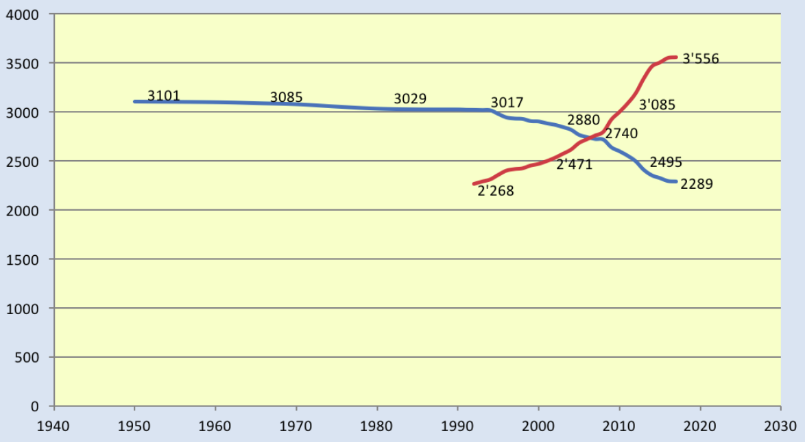 Blue: Overall number of municipalities in Switzerland. Red: Average number of inhabitants per municipality. Author: Seadart CC BY-SA 3.0