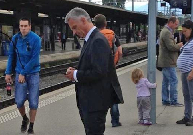 Swiss president Didier Burkhalter waiting for a train (2014)