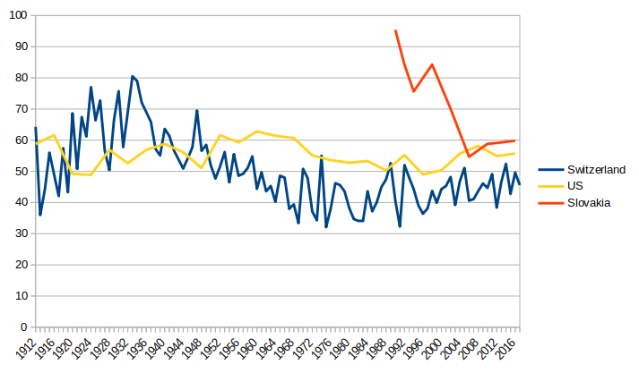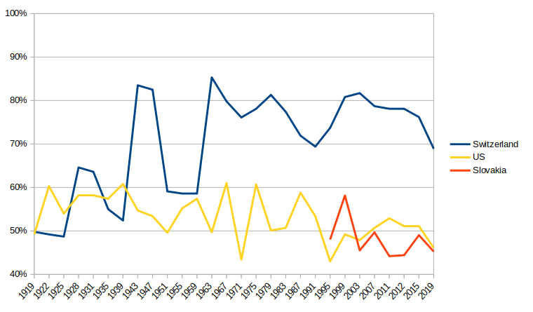 A mixed bag. Turnout at referenda in Switzerland. Turnout at presidential elections in the US. Turnout at parliamentary elections in Slovakia.