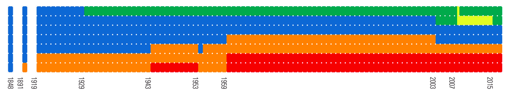 Following diagram shows how the seven seats in the Federal Council were distributed among the parties. Blue stands for FDP.The Liberals, orange for Christian Democratic People's Party (CVP), green for Swiss People's party (SVP), red for Social Democratic Party (SP) and yellow for Conservative Democratic Party (BDP). The diagram is getting gradually more colorful and tracks the progress of concordance mindset over the course of history.