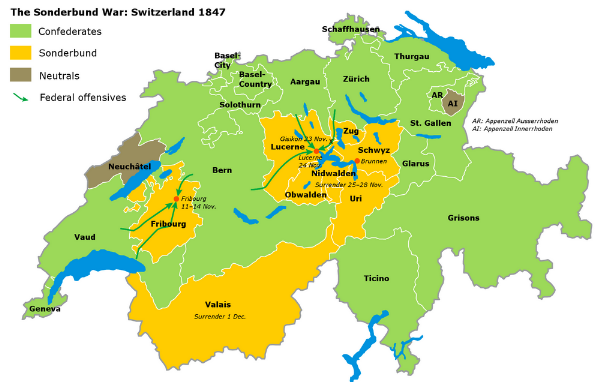 In 1845, catholic cantons formed the so-called Sonderbund ("Separate Alliance") and split from the rest of the confederation. That led to the civil war among catholic and protestant cantons in 1847 won by the protestants. As a direct consequence of the war, the modern, federal Switzerland was formed and the cantons lost their independence.