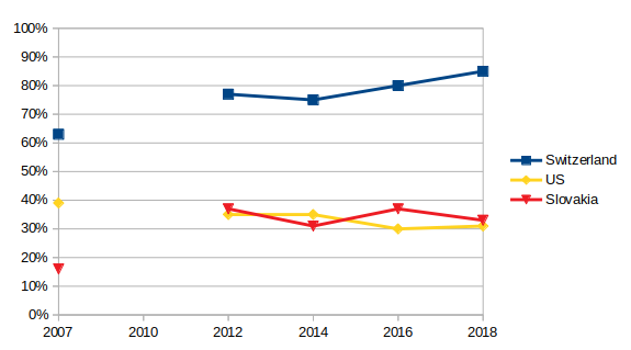 As can be seen, both countries wobble around 50%. Naively, one would expect that legitimacy in a democratic country cannot fall below 50%. Whoever is supported by less than half of the voters should be outvoted and unable to form a government. In reality, however, there are many ways to fall into this trap. A country may have a weird electoral system (US), it may have a minority or bureaucratic government (Belgium) or, as in the case of Slovakia, quotas for the entry into the parliament can leave a large part of the voters (28.5%) without representation in the parliament, let alone in the government.