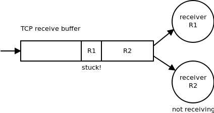 Imagine two receivers reading from the same TCP connection. If one of them (R2) is not reading the data — maybe because it's busy doing some other work at the moment — the data linger in the TCP receive buffer and block all the remaining data in the buffer, including the data that belong to the other receiver (R1). This way, one slow or stuck service blocks all the other services sharing the same TCP connection: