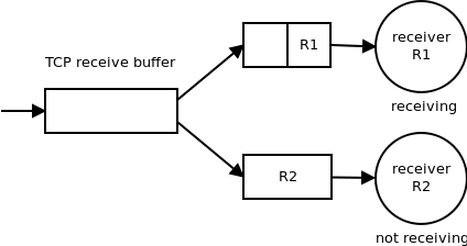 While the above algorithm solves the problem of blocking it is prone to memory exhaustion. If the asynchronous reader reads the data from TCP buffer faster than the receivers are able to consume it the per-receiver buffers will gradually grow and eventually run out of memory.