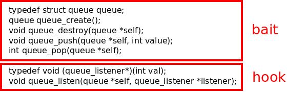 The "bait" is the part that lures the prey. It attracts programmers same way as anglerfish attracts a shrimp. It does so by being useful. C language has no stadard containers so, yeah, it is an attractive proposition. You won't have to implement a queue for the umpteenth time. The implementation is efficient and the API is clean. The "listen" function is a bit weird but we are not going to use it anyway, so who cares?