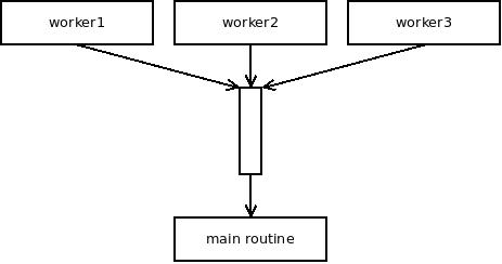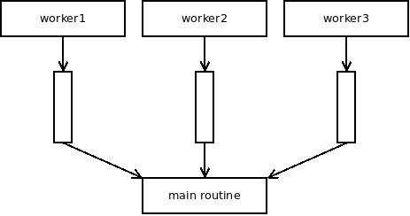 Let's consider a different way of implementing the same thing though. Let us have one channel per worker goroutine. Main goroutine will then select{} on those channels to get the messages. In theory, it works the same as the original one channel design. Channels use simple probabilistic scheduler. So does select. The behaviour should therefore be identical:
