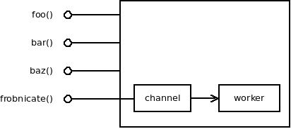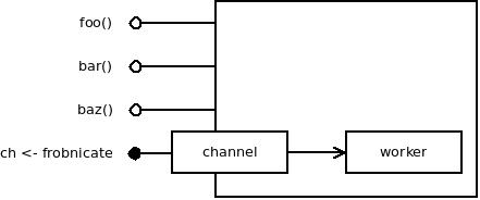 Imagine an object. It has some functions, some properties and so on. It also contains a running goroutine. The goroutine does useful work based on commands sent to it via a channel. We would like to hide the implementation of the object behing a nice API and so we create some new functions to steer the goroutine. For example, forbnicate() function will create a 'frobnicate' command and send it to the channel. Nice, isn't it?