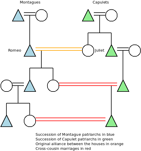 Enter preferential cross-cousin marriage. In anthropology of kinship systems, this is a staple. In many societies there's a strong preference for a person to marry the child of their mother's brother or the child of thier father's sister. In case of Montagues and Capulets, Juliet's brother, now head of house Capulet, will be obliged to marry his son to Juliet's daugther, i.e. to a Montague.